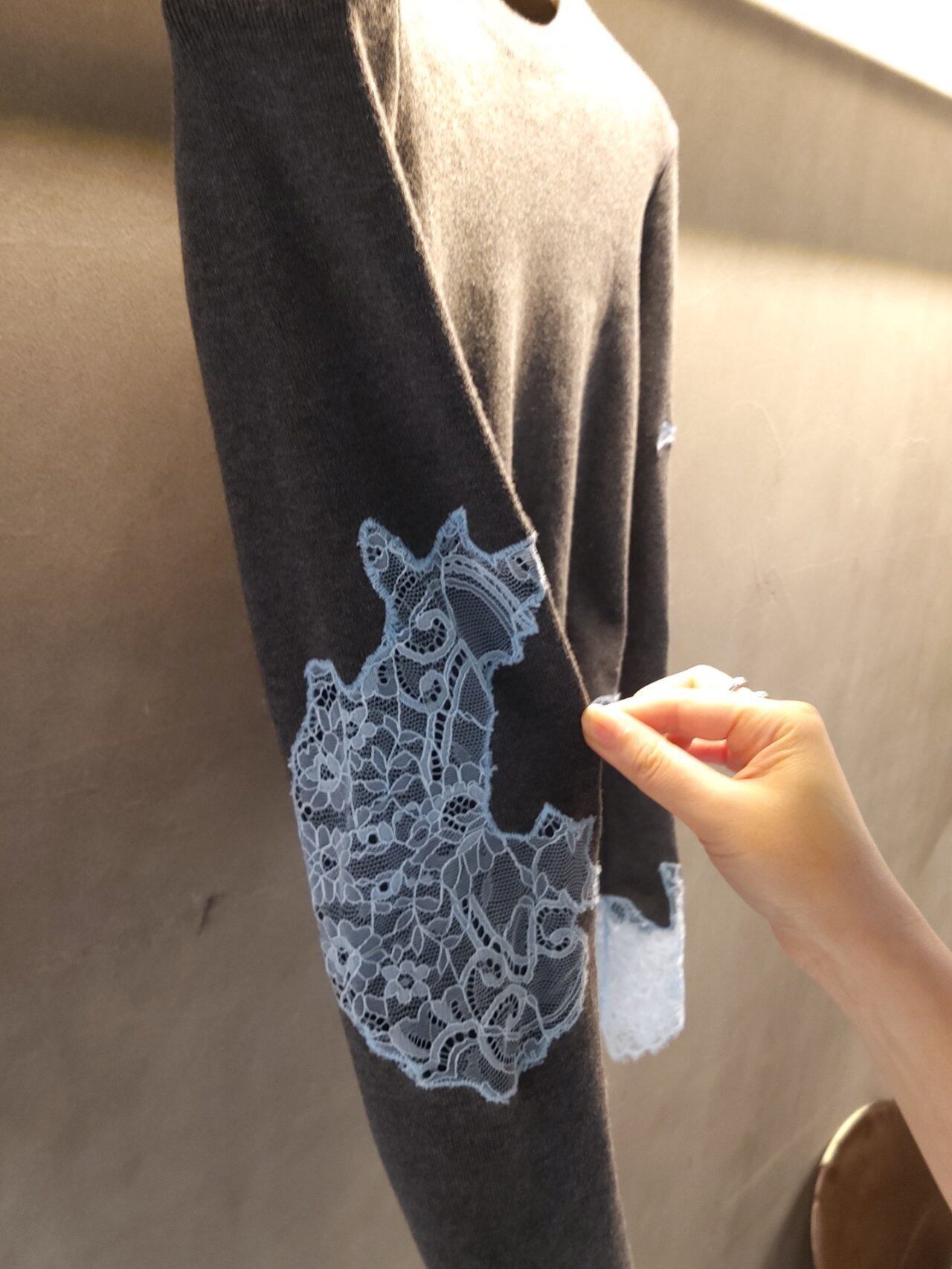 シンプルなグレーニットにブルーレースをあしらい、ユニークでエレガントな雰囲気を演出します。