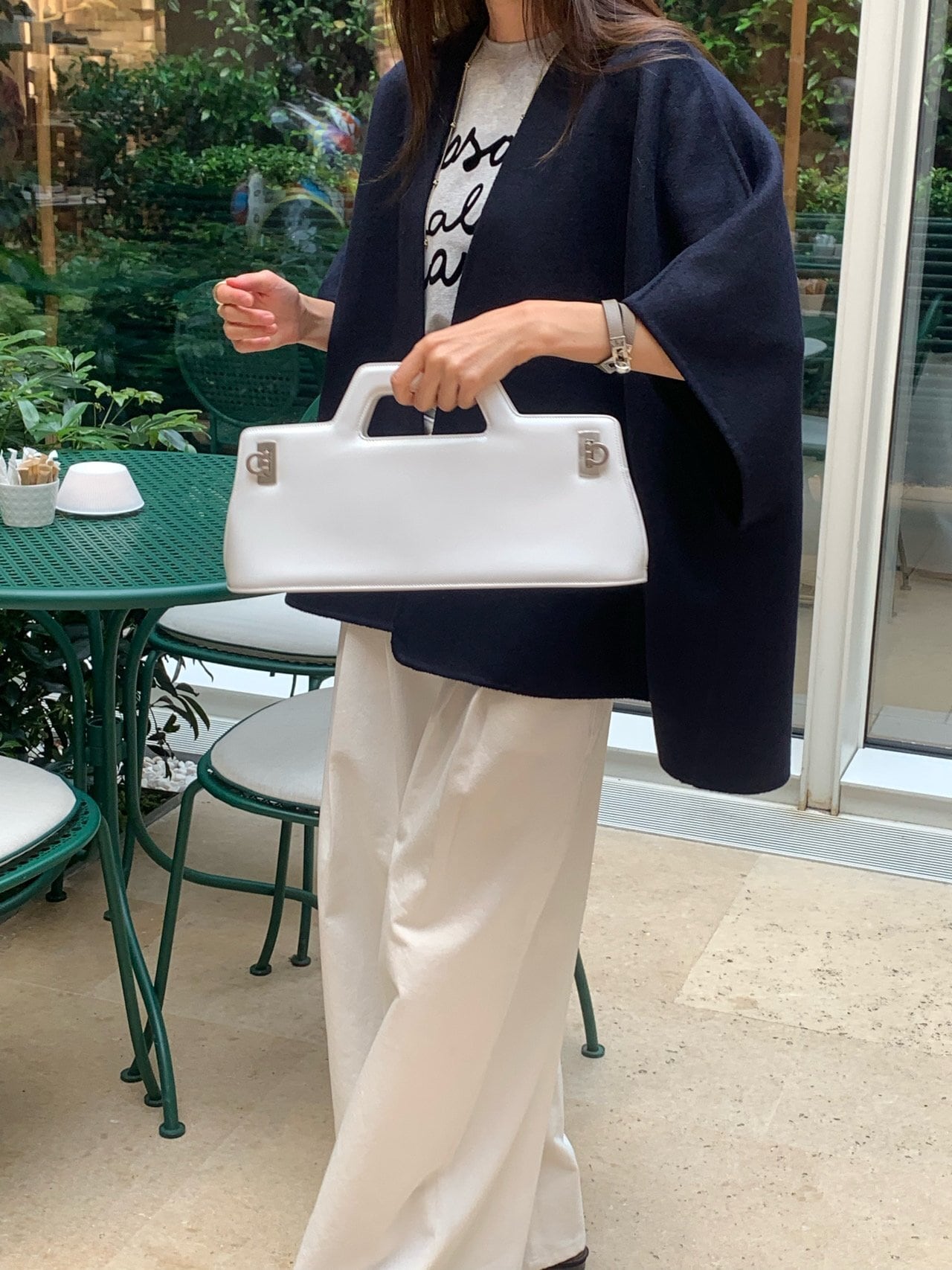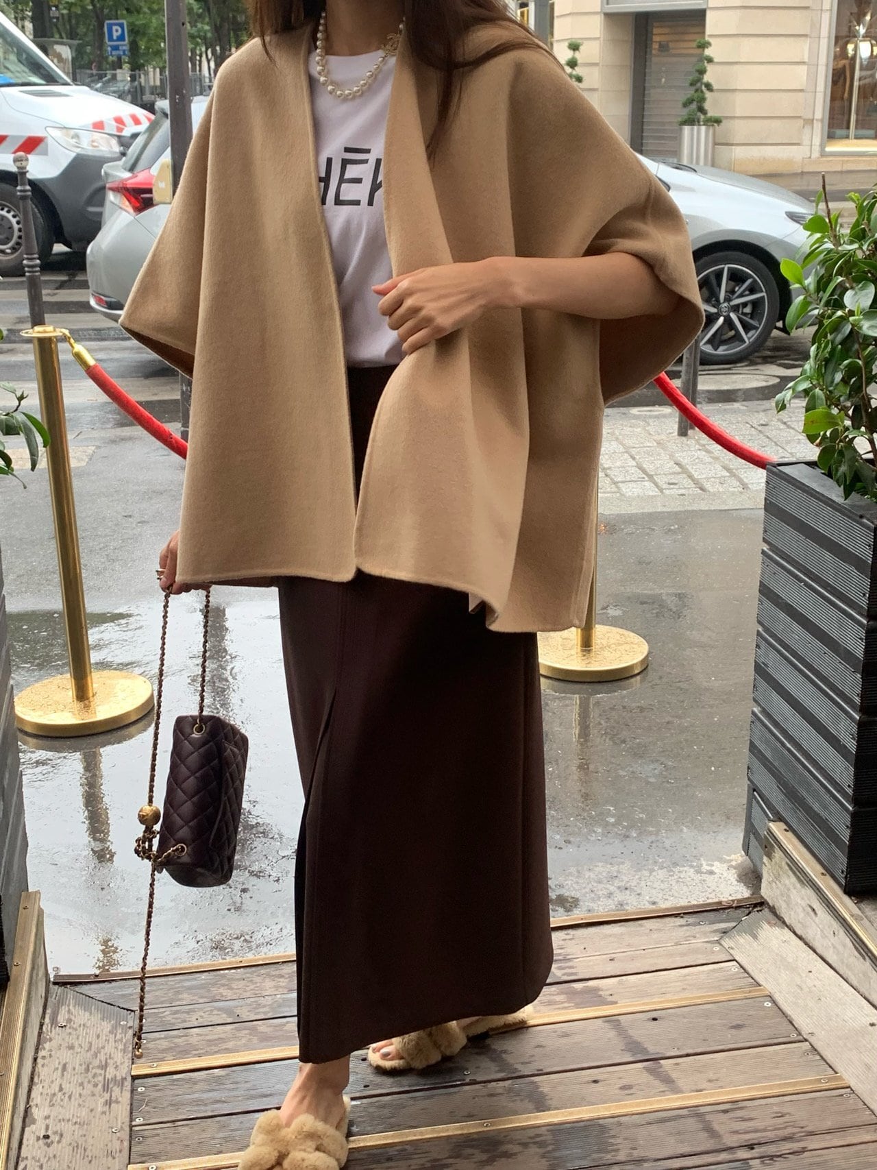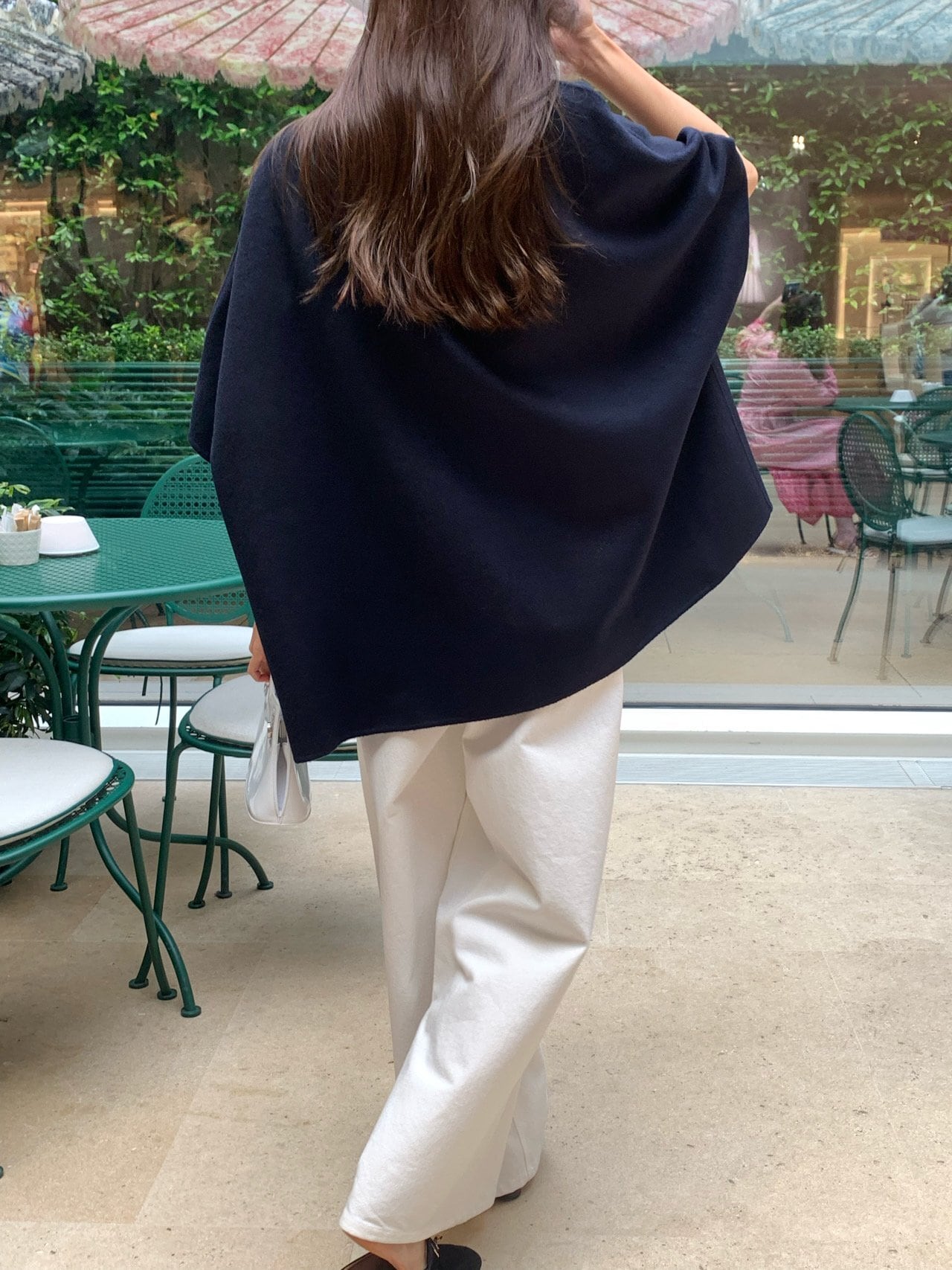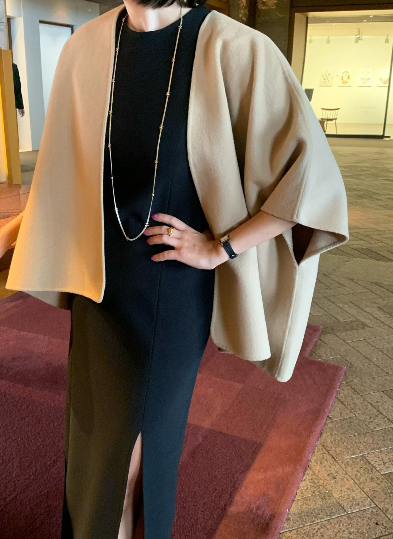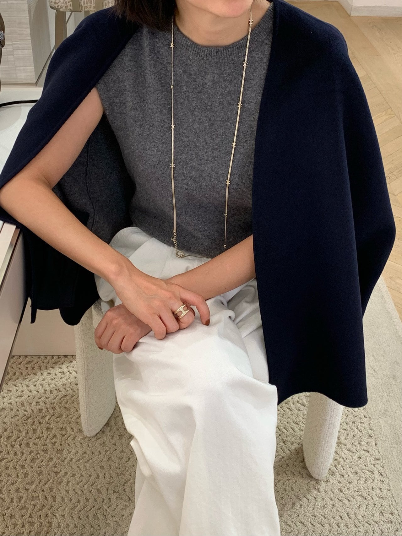 さっと肩にかけるだけで、シンプルな装いに洗練された雰囲気が生まれます。